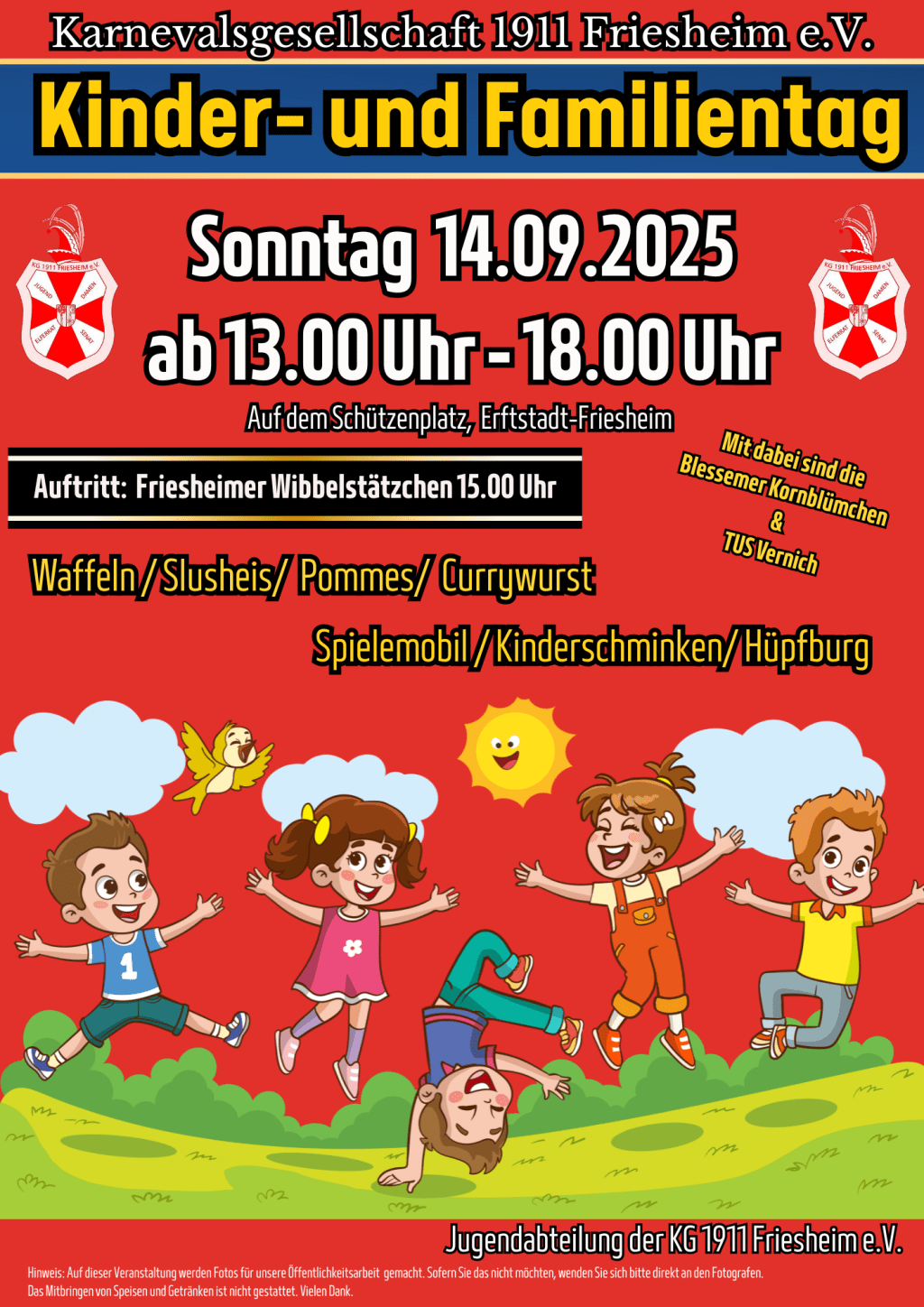 Wie in jedem Jahr veranstaltet die Friesheimer Traditionsgesellschaft wieder ihren beliebten Kinder-und Familientag, diesmal am Sonntag, dem 14.9.2025 von 13.00 – 18.00 Uhr auf dem Schützenplatz in Friesheim, Christian-Dahmen-Str.